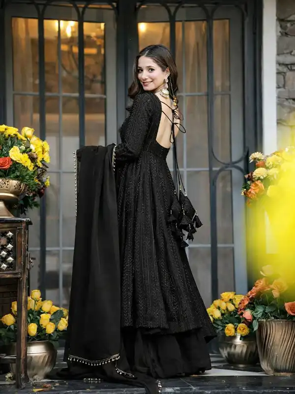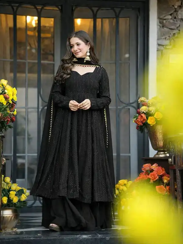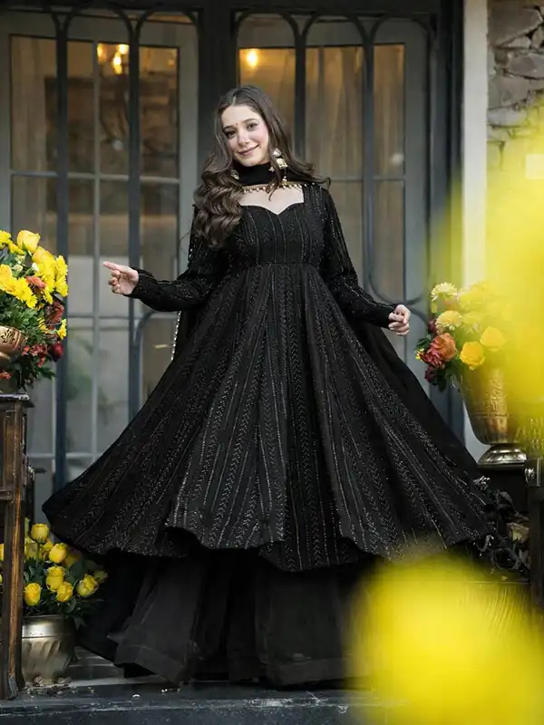 Make a bold statement with this stunning black Anarkali sharara suit, crafted from premium faux blooming fabric with heavy sequins and zari embroidery—perfect for weddings, parties, and festive occasions.