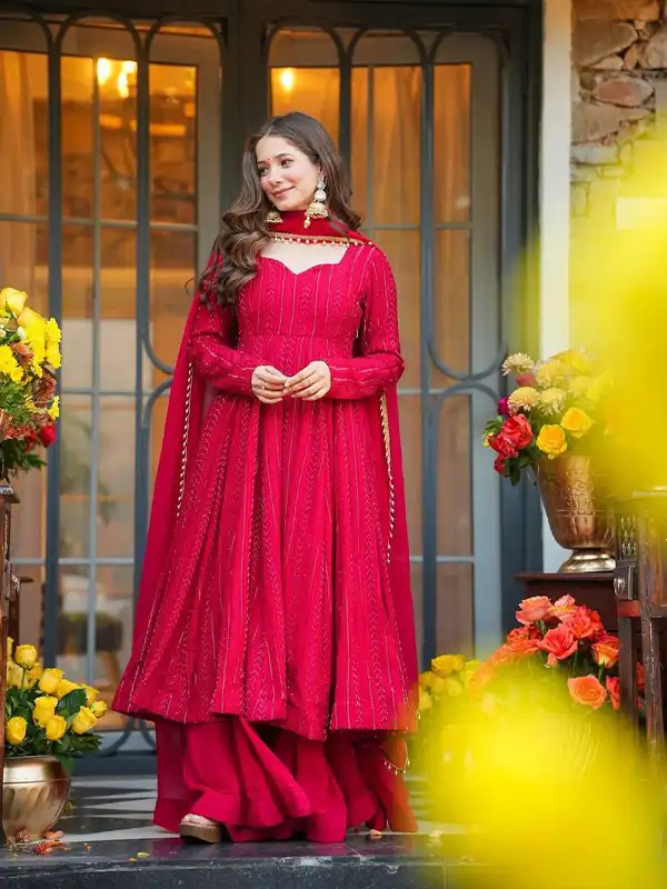 Upgrade your ethnic look with this stunning Anarkali sharara suit in lal pink, crafted from faux blooming fabric with heavy sequins and zari embroidery—perfect for weddings and festive occasions.