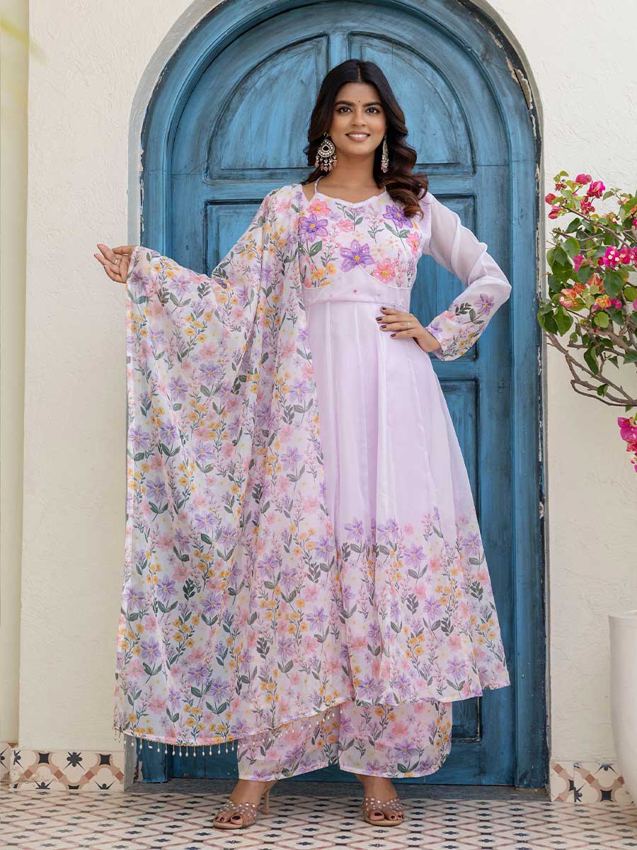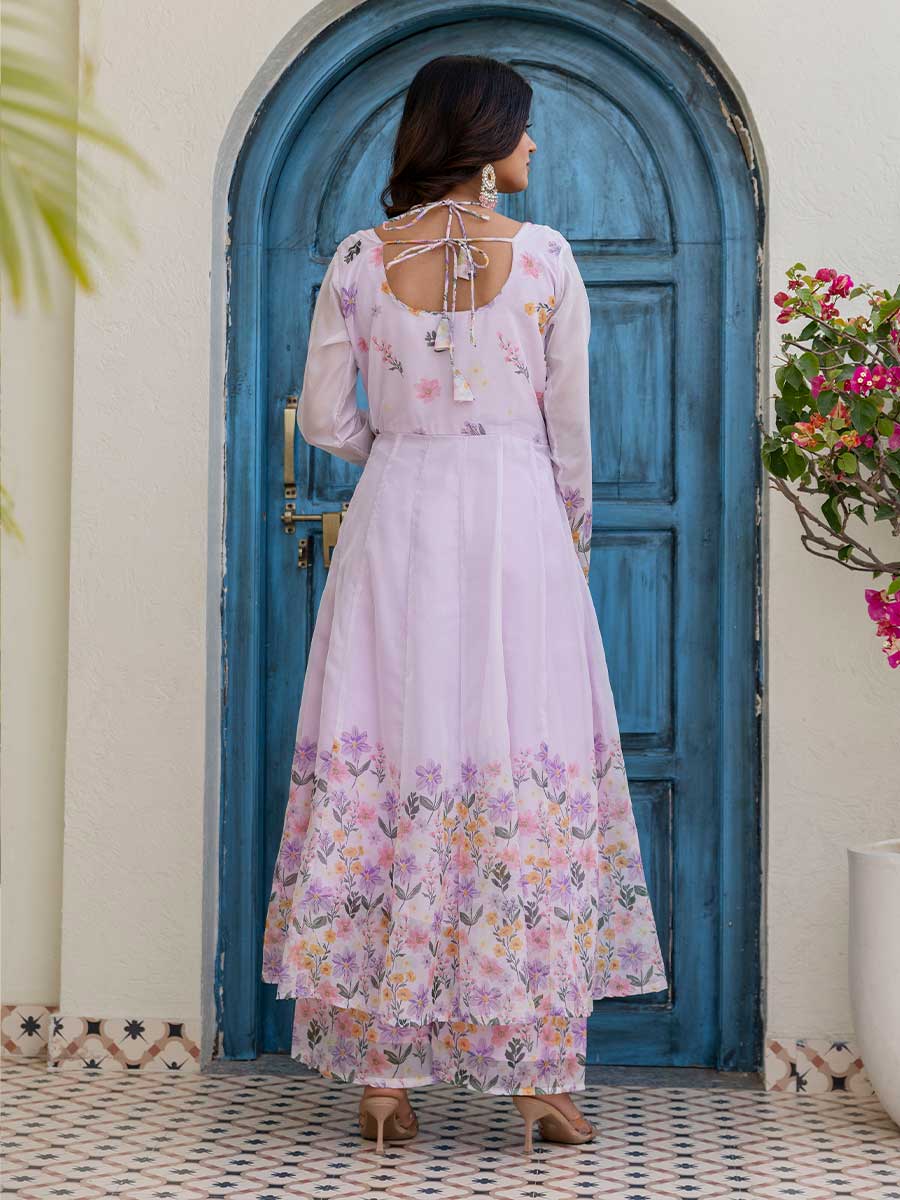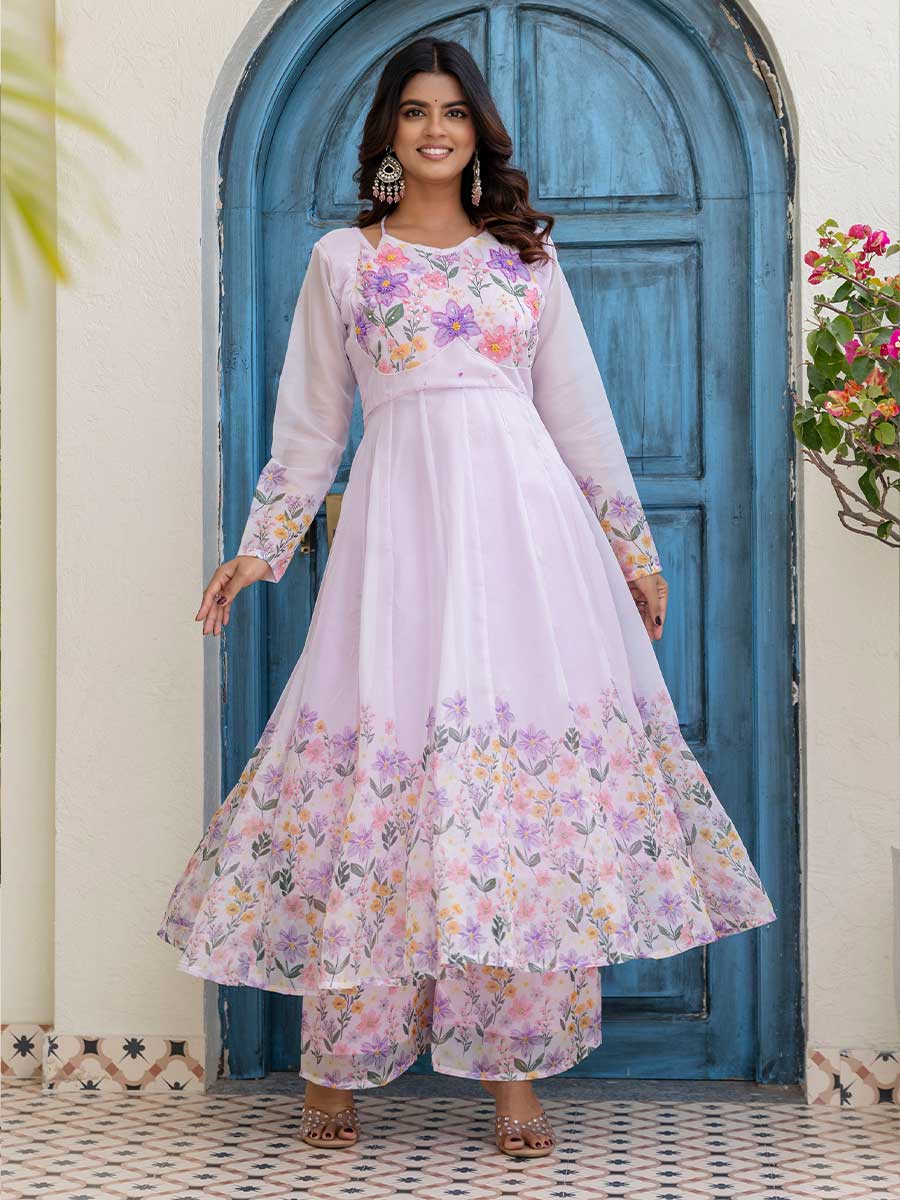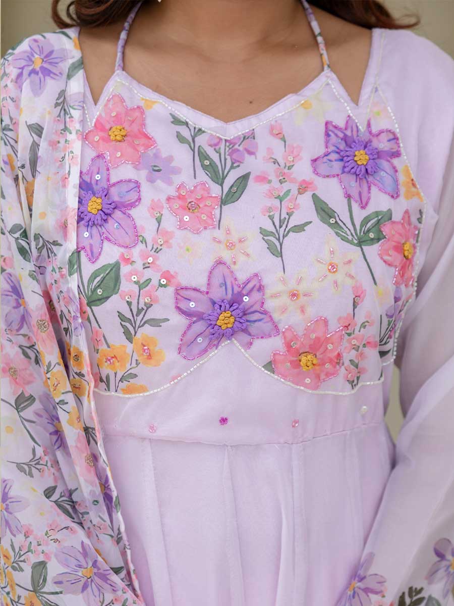 Gown: Digital print + handwork, 48” length, 4m flair, full sleeves, fancy neck, micro full lining, stitched, sizes M-38, L-40, XL-42, XXL-44