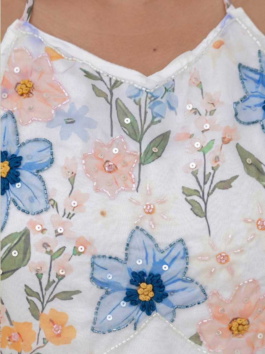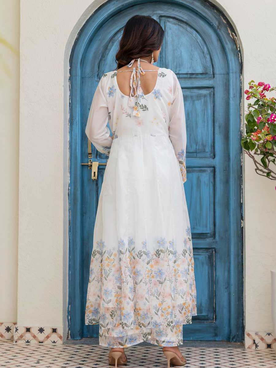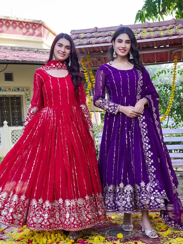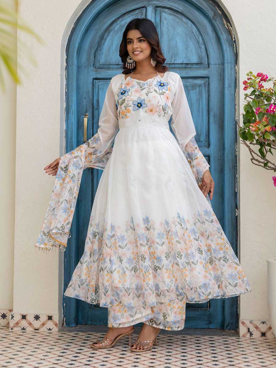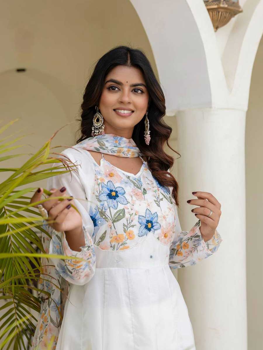 Gown: Digital print + handwork, 48” length, 4m flair, full sleeves, fancy neck, micro full lining, stitched, sizes M-38, L-40, XL-42, XXL-44